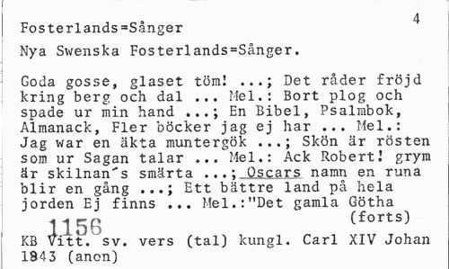 //// Fosterlands=Sånger ^ //// Nya Swenska Fosterlands=Sånger. //// Goda gosse, glaset töm! .Det råder fröjd kring berg och dal ... Mel.: Bort plog och spade ur min hand En Bibel, Psalmbok, //// Almanack, Fler böcker jag ej har ... Mel.: Jag war en äkta muntergök ...; Skön är rösten som ur Sagan talar ...Mel.: Ack Robert! grym är skilnan's smärta ...; Oscars namn en runa blir en gång ...; Ett bättre land på hela jorden Ej finns ... Mel.:"Det gamla Götha //// 1156 Cforts) //// KB Vitt. sv. vers (tal) kungl. Carl XIV Johan 1943 (anon) ////