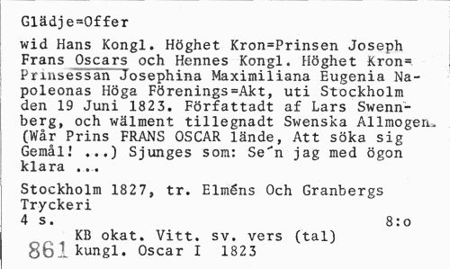 //// Glädj e=Of fer //// wid Hans Kongl. Höghet Kron=Prinsen Joseph Frans Oscars och Hennes Kongl. Höghet Kron= Prinsessan Josephina Maximiliana Eugenia Na-poleonas Höga Förenings=Akt, uti Stockholm den 19 Juni 1823. Pörfattadt af Lars Swenn-berg, och wälment tillegnadt Swenska Allmogen* (Wår Prins FRANS OSCAR lände, Att söka sig Gemål! ...) Sjunges som: Se^n jag med ögon klara ... //// Stockholm 1827, tr. Elméns Och Granbergs Tryckeri //// 4 s. 8:o //// KB okat. Vitt. sv. vers (tal) 861 kungl. Oscar I 1823 ////