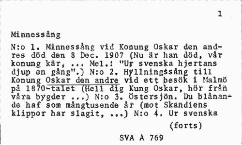 //// 1 //// Minnessång //// N:o 1. Minnessång vid Konung Oskar den andres död den 8 Dec. 1907 (Nu är han död, vår konung kär, .Mel.i "Ur svenska hjertans djup en gång".) N:o 2. HVllningSsång till Konung Oskar den andre vid ett besök i Malmö på 18701-talet (Hell dig Kung Oskar, hör från våra bygder .,.) N:o 3. Östersjön. Du blånande haf som mångtusende år (mot Skaiidiefts klippor har slagit, ...) N:o 4. Ur svenska //// (forts) //// SVA A 769 ////