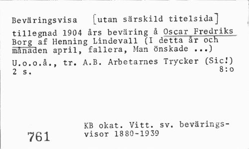 //// Beväringsvisa [utan särskild titelsida] //// tillegnad 1904 års beväring å Oscar Fredriks Borg af Henning Lindevall (I detta år och månaden april, fallera, Man önskade ...) //// U.o.o.å., tr. A.B. Arbetarnes Trycker (SicJ) 2 s. 8:0 //// KB okat. Vitt. sv. bevärings-761 visor 1880-1939 ////