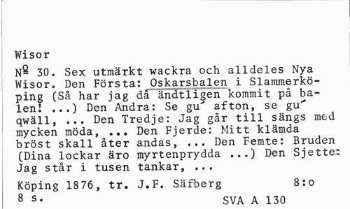 //// Wisor //// N- 30. Sex utmärkt wackra och alldeles Nya Wisor. Den Första: Oskarsbalen i Slammerkö-ping (Så har jag då ändtligen kommit på ba-lenJ ...) Den Andra: Se gu' afton, se gu"* qwäll, ... Den Tredje: Jag går till sängs med mycken möda, ... Den Fjerde: Mitt klämda bröst skall åter andas, ... Den Femte: Bruden (Dina lockar äro myrtenprydda ...) Den Sjette: Jag står i tusen tankar, ... //// Köping 1876, tr. J.F. Säfberg 8:0 //// 8 s• SVA A 130 ////