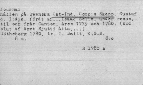 //// J ournal //// nållen på Svenska Qst-Ind . Comp; s Skepp. Gustaf i. 3:dje, förd t afTTTTsair^rr^;'' ätftfer resan, til och från Canton^åren 1779 och 1780. (Wid 3 lu t af året Sjutti åtta,...) jöthetorg 17801 tr. I. Smitt, K..G.B. //// 8 s. 8:o //// R 1780 a ////