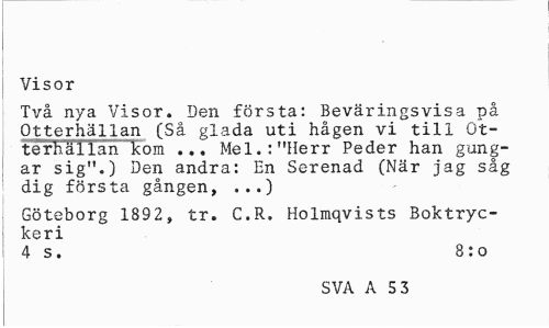 //// Visor //// Två nya Visor. Den första: Beväringsvisa på Otterhällan (Så glada uti hågen vi till Gt-térhäilan kom ... Mel.:"Herr Peder han gungar sig".) Den andra: En Serenad (När jag såg dig första gången, ...) //// Göteborg 1892, tr. C.R. Holmqvists Boktryckeri //// 4 s. 8:0 //// SVA A 53 5 ////