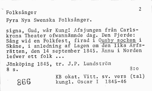 //// 2 //// Folksånger //// Fyra Nya Swenska Folksånger. //// signa, Gud, wår Kung! Afsjungen från Carls-krona Theater ofwannämnde dag. Den Fjerde: Sång wid en Folkfest, firad i Ousby socken i Skåne, i anledning af Lagen om den lika Arfs-rätten, den 14 september 1845. Ännu i Norden lefwer ett folk ... //// Jönköping 1845, tr. J.P. Lundström 8 s. 3: o //// KB okat. Vitt. sv. vers (tal) g66 kungl. Oscar I 1845-46 ////