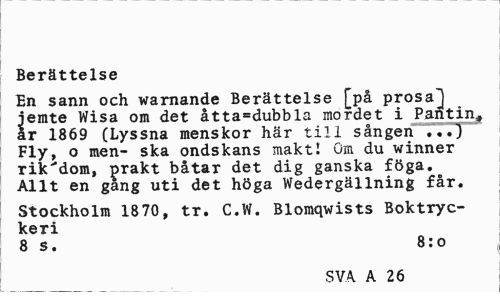 //// Berättelse //// En sann och warnande Berättelse [på prosa^j iemte Wisa om det åtta=dubbla mordet i Pantin, år 1869 (Lyssna menskor här till sången ...) Fly, o men- ska ondskans makt! um du winner rikedom, prakt båtar det dig ganska föga. Allt en gang uti det höga Wedergällning får. //// Stockholm 1870, tr. C.W. Blomqwists Boktryckeri //// 8 s. 8:o //// SVA A 26 ////