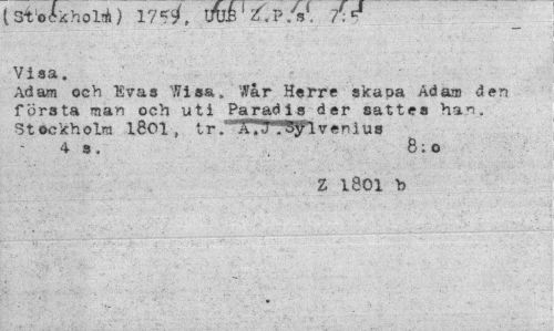 //// 1 srotaholtt } 17.7, UTIE z .P .'s\ /; ^ Visa. //// Adam och Evas Wiss, »Vår Herre skapa Adai» den föra ta man och uti Paradis der sattes han, Stockholm 1801, tr ."TTTTS^lvenius //// 4 s. 8;o //// Z 1801 b ////