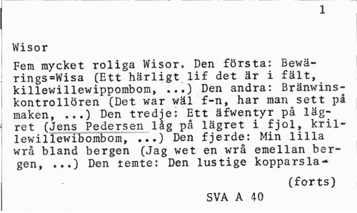 //// 1 //// Wisor //// Fem mycket roliga Wisor. Den första: Bewä-rings=Wisa (Ett härligt lif det är i fält, killewillewippombom, ...) Den andra: Bränwins-kontrollören (Det war wäl f-n, har man sett på maken, ...) Den tredje: Ett äfwentyr på lägret (Jens Pedersen låg på lägret i fjol, kril-lewiliewibombom, ...) Den fjerde: Min lilla wrå bland bergen (Jag wet en wrå emellan bergen, ...) Den temte: Den lustige kopparsla- //// (forts) //// SVA A 40 ////