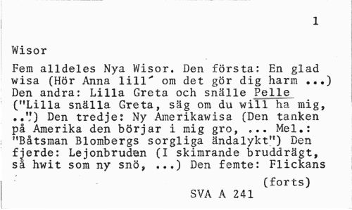 //// 1 //// Wisor //// Fem alldeles Nya Wisor. Den första: En glad wisa (Hör Anna lill" om det gör dig harm ...) Den andra: Lilla Greta och snälle Pelle ("Lilla snälla Greta, säg om du will ha mig, ..'') Den tredje: Ny Amerikawisa (Den tanken på Amerika den börjar i mig gro, ... Mel.: "Båtsman Blombergs sorgliga ändalykt") Den fjerde: Lejonbruden (I skimrande bruddrägt, så hwit som ny snö, ...) Den femte: Flickans //// (forts) //// SVA A 241 ////