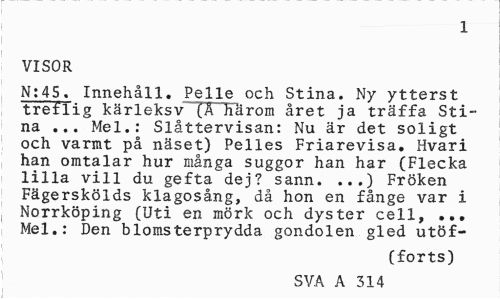 //// 1 //// VISOR //// N:45. Innehåll. Pelle och Stina. Ny ytterst treflig kärleksv (A härom året ja träffa Stina ... Mel.: Slåttervisan: Nu är det soligt och varmt på näset) Pelles Friarevisa. Hvari han omtalar hur många suggor han har (Flecka lilla vill du gefta dej? sann. ...) Fröken Fägerskölds klagosång, då hon en fånge var i Norrköping (Uti en mörk och dyster cell, ... Mel.: Den blomsterprydda gondolen gled utöf- //// (forts) //// SVA A 314 //// i ////