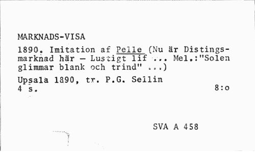 //// MARKNADS-VISA //// 1890. Imitation af Pelle (Nu är Distingsmarknad här - Lustigt lif ... Mel.:"Solen glimmar blank och trind" >».) //// Upsalä 1890, tr. P.G. Sellin 4 s. 8: o //// SVA A 458 //// "V ////