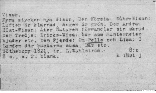 //// Vi sor. //// Fyra styckar rya Wisor, Der Först»: Wihr-Wjsan; Lufter är klarnad. Än är «rrcn. Der Ar dra; Höst-Wi san; Ater Naturen förvandlar sir skrud . Der Tredje; Brieks-Wisa;. Ear som munterheten bjuder etc. "Den Fjerde: Om Pelle och Lisa: I Lunden dar bäckarna susa, Dar etc. OÖthefcorc 13.21, tr. L.Wahlström. • 3:o //// 8 s., s. 2. blar.i. K 1Ö21 j ////