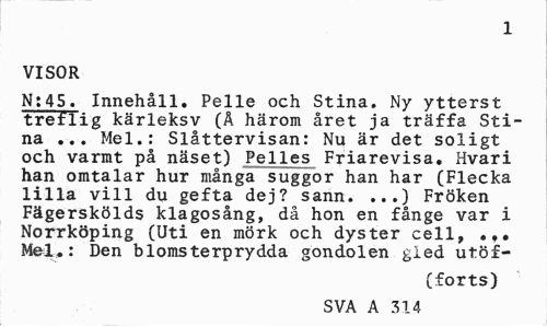 //// 1 //// VISOR //// N:45. Innehåll. Pelle och Stina. Ny ytterst treflig kärleksv (Ä härom året ja träffa Stina ... Mel.: Slåttervisan: Nu är det soligt och varmt på näset) Pelles Friarevisa. Hvari han omtalar hur många suggor han har (Flecka lilla vill du gefta dej? sann. ...) Fröken Fägerskölds klagosång, då hon en fånge var i Norrköping (Uti en mörk och dyster cell, ... Mel.: Den blomsterprydda gondolen gled utöf- //// (forts) //// SVA A 314 80 ////
