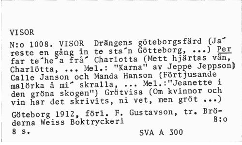 //// VISOR //// N:o 1008. VISOR Drängens göteborgsfärd (Ja" reste en gång in te sta'n Götteborg, ...) Per far te"he"a frå" Charlotta (Mett hjärtas vän, Charlötta, ... Mel.: "Karna" av Jeppe Jeppson) Calle Janson och Manda Hanson (Förtjusande malörka å mi" skralla, ... Mel.:"Jeanette i den gröna skogen") Grötvisa (Om kvinnor och vin har det skrivits, ni vet, men gröt ..,) //// Göteborg 1912, förl. F. Gustavson, tr. Bröderna Weiss Boktryckeri 8:0 //// 8 s# SVA A 300 ////
