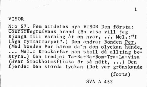 //// 1 //// VISOR //// N:o 57. Fem alldeles nya VISOR Den första: CourirSegrufvans brand (En visa vill jag sjunga till varning åt en hvar, ... Mel.:"I låga ryttartorpet".) Den andra: Bonden Per. (Med bonden Per härom da^n den olyckan hände, ... Mel.: Klockarfar han skall då allting bestyra.) Den tredje: Ta-Ra-Ra-Bom-Tra-La-visa (Hvar Stockholmsflicka är så nätt, ...) Den fjerde: Den störda lyckan (Det var grönskande //// (forts) //// SVA A 2 452 ////