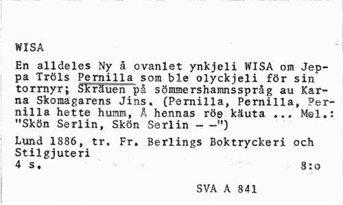 //// WISA //// En alldeles Ny å cvanlet ynkjeli WISA om Jep-pa Tröls Pernilla som ble olyckjeli för sin torrnyrj skräuen på sömmershamnsspråg au Karna Skomakarens Jins. (Pernilla, Pernilla, Pernilla hette humm, Å hennas röe käuta ... Mel.: "Skön Serlin, Skön Serlin --") //// Lund 1886, tr. Fr, Berlings Boktryckeri och Stilgjuteri //// 4 s. 8:0 //// SVA A 841 ////