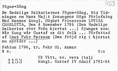 //// Fägne=Sång //// De Redelige Dalkarlarnes Fägne=Sång, Wid Tidningen om Hans Maj:t Konungens Höga Förlofning Med Hennes Kongl. Höghet Prinsessan LOVISA CHARLOTTA, Den B Nowember 1795 (Den Redelige Dalkarins röst Från hjertat ...) Sjunges som: Wår Kung wår Gustaf se dit folk ... Författad af Knut Pehr Persson (Den fröjd sig i hjertat nu sprider ...) //// Fahlun 1796, tr. Pehr 01. Axmar 8 s. 8:o //// KB Vitt. sv. vers (tal) 1153 kungl. Gustaf IV Adolf 1792-95 ////