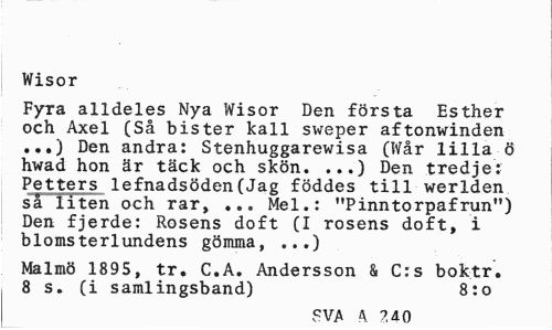 //// Wisor //// Fyra alldeles Nya Wisor Den första Esther och Axel (Så bister kall sweper aftonwinden ...) Den andra: Stenhuggarewisa (Wår lilla ö hwad hon är täck och skön. ...) Den tredje: Petters lefnadsöden(Jag föddes till werlden så liten och rar, ... Mel.: "Pinntorpafrun") Den fjerde: Rosens doft (I rosens doft, i blomsterlundens gömma, ...) //// Malmö 1895, tr. C.A. Andersson & C:s boktr. 8 s. (i samlingsband) 8:0 //// SVA k 2åQ ////