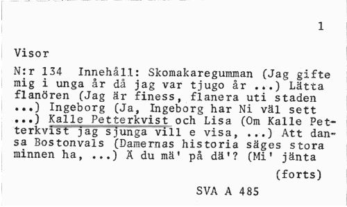 //// 1 //// Visor //// N:r 134 Innehåll: Skomakaregumman (Jag gifte mig i unga år då jag var tjugo år .*.) Lätta flanören (Jag är finess, flanera uti staden ...) Ingeborg (Ja, Ingeborg har Ni väl sett ...) Kalle Petterkvist och Lisa (Om Kalle Petterkvist jag sjunga vill e visa, ...) Att dansa Bostonvals (Damernas historia säges stora minnen ha, ...) Ä du mä' på dä'? (Mi' jänta //// (forts) //// SVA A 485 7 ////
