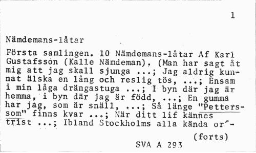 //// 1 //// Nämdemans-iåtar //// Första samlingen, 10 Nämdemans-låtar Af Karl Gustafsson (Kalle Nämdeman). (Man har sagt åt mig att jag skall sjunga Jag aldrig kun- //// nat älska en lång och reslig tös, ...; Ensam i min låga drängastuga ...; I byn där jag är hemma, i byn där jag är född, En gumma //// har jag, som är snäll, ...; Så länge "Petters-som" finns kvar När ditt lif kännes //// trist Ibland Stockholms alla kända or'- //// (forts) //// SVA A 29 3 ////