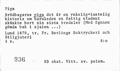 //// Piga //// Brödbagarns piga det är en ynkelig=lustelig historia om huruledes en fattig student skänkte bort sin sista tredaler (Med ögonen gömda bak i själen ...) //// Lund 1879, tr. Fr. Berlings Boktryckeri och Stilgjuteri //// 4 s. 8:0 //// 936 KB okat. Vitt. sv. polem. ////