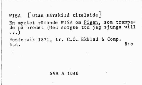 //// WISA tutan särskild titelsidaJ //// En mycket rörande WISA om Pigan, som trampade på brödet (Med sorgse ton jag sjunga will //// Westerwik 1871, tr. C.O. Ekblad & Comp. 4-s. 8:0 //// SVA A 1046 ////