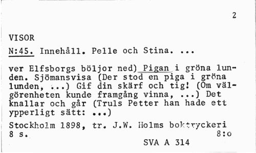 //// 2 //// VISOR //// N:45. Innehåll. Pelle och Stina. ... //// ver Elfsborgs böljor nedl Pigan i gröna lunden. Sjömansvisa (Der stod en piga i gröna lunden, ...) Gif din skärf och tig! (Om välgörenheten kunde framgång vinna, ...) Det knallar och går (Truls Petter han hade ett ypperligt sätt: ...) //// Stockholm 1898, tr. J.W. Holms boktryckeri 8 s. 8:o //// SVA A 314 ////