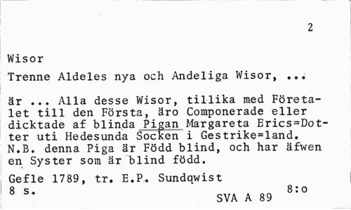 //// 2 //// Wisor //// Trenne Aldeles nya och Andeliga Wisor, ... //// är ... Alla desse Wisor, tillika med Företalet till den Första, äro Componerade eller dicktade af blinda Pigan Margareta Erics=Dot-ter uti Hedesunda Socken i Gestrike=land. N.B. denna Piga är Född blind, och har äfwen en Syster som är blind född. //// Gefle 1789, tr. E.P. Sundqwist //// 8 s. „ 8:o //// SVA A 89 ////