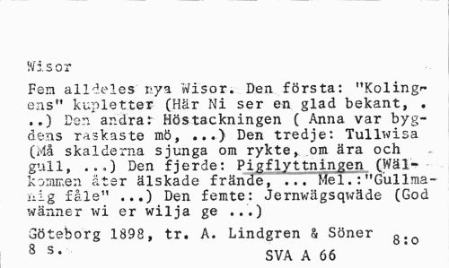 //// Wisor //// Fen alldeles nya Wisor. Den första: "Kolingr* ens" kupletter (Här Ni ser en glad bekant, . ..) Den andrar Hös täckningen ( Anna var bygdens raskaste mö, ...) Den tredje: Tullwisa (Må skalderna sjunga om rykte, om ära och gull, . ..) Den fjerde: Pigflyttningen (Wä Inkommen åter älskade frände, ... Mel.:"Gullma-iiig fåle" ...) Den femte: Jernwägsqwäde (God wänner wi er wilja ge ...) //// Göteborg 1898, tr. A. Lindgren & Söner fi._ //// Q c 0,0 //// 8 s< SVA A 66 ////