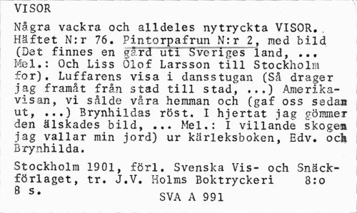 //// VISUR //// Några vackra och alldeles nytryckta VISOR.. Häftet N:r 76. Pintorpafrun N:r 2, med bild (Det finnes en gård uti Sveriges land, ... Mel.: Och Liss Olof Larsson till Stockholm for). Luffarens visa i dansstugan (Så drager jag framåt från stad till stad, ...) Amerikavisan, vi sålde våra hemman och (gaf oss sedan ut, ...) Brynhildas röst. I hjertat jag gömmer den älskades bild, ... Mel.: I villande skogea jag vallar min jord) ur kärleksboken, Edv. och Brynhilda. //// Stockholm 1901, förl. Svenska Vis- och Snäck-förlaget, tr. J.V. Holms Boktryckeri 8:o //// 8 s* SVA A 991 ////