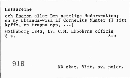 //// Hussarerne //// och Poeten eller Den nattliga Hederswakten; en ny Eklanda-wisa af Cornelius Munter (I sitt kyffe, en trappa opp, ...) //// Götheborg 1843, tr, C.M. Ekbohrns officin 8 s. 8:0 //// 916 //// KB okat. Vitt. sv. polem. ////