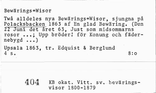 //// Bewärings=Wisor //// Twå alldeles nya Bewärings=Wisor, sjungna på Polacksbacken 1863 af En glad Bewäring. (Den 22 Juni det året 63, Just som midsommarns rosor Upp bröder.' för Konung och fäder- //// nebygd .. „) //// Upsala 1863, tr. Edquist & Berglund 4 s. 8:o //// t KB okat, Vitt. sv. bevärings- //// visor 1800-713 ////