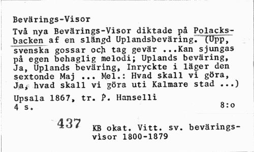 //// Bevärings-Visor //// Två nya Bevärings-Visor diktade på Polacksbacken af en slängd Uplandsbeväring. (Upp, svenska gossar ocji tag gevär ...Kan sjungas på egen behaglig melodi; Uplands beväring, Ja, Uplands beväring, Inryckte i läger den sextonde Maj ... Mel.: Hvad skall vi göra, Ja* hvad skall vi göra uti Kalmare stad ...) //// Upsala 1867, tr. f». Hanselli 4 s. 8:0 //// 437 jrg okat. Vitt. sv. bevärings- //// visor 1800-1879 ////