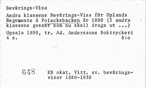 //// Bevärings-Visa //// Andra klassens Bevärings-Visa för Uplands Regemente å Polacksbacken år 1890 (I andra klassens gossar som nu skall draga ut ..,) //// Upsala 1890, tr. Ad. Anderssons Boktryckeri 4 s. 8:o //// Rft9 KB okat. Vitt. sv. bevärings- //// visor 1880-1939 ////