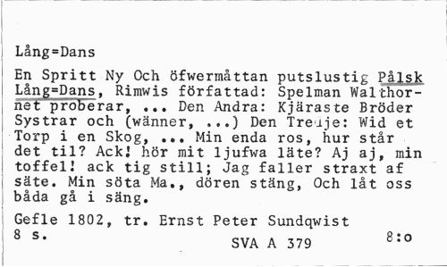 //// Lång=Dans //// En Spritt Ny Och öfwermåttan putslustig På}?k Lång=Dans, Rimwis författad: Spelman Walthor-net pröberar, ... Den Andra: Kjäraste Bröder Systrar och (wänner, ,..) Den Tredje: Wid et Torp i en Skog, ... Min enda ros, hur står det til? AckJ hör mit ljufwa läte? Aj aj, min toffell ack tig still; Jag faller straxt af säte. Min söta Ma., dören stäng, Och låt oss båda gå i säng. //// Gefle 1802, tr. Ernst Peter Sundqwist 8 S' SVA A 379 8:0 ////