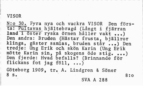 //// VISOR //// N:o 30. Fyra nya och vackra VISOR Den förs-ta: Pultavas hjältebragd (Långt i fjärran land i öster ryska örnen håller vakt ...) Den andra: Bruden (Hästar frusta, bjällror klinga, gäster samlas, bruden står ...) Den tredje: Ung Erik och skön Karin (Ung Erik mötte Karin sin, på skogens öde stig. ...) Den fjerde: Hvad befalls? (Brinnande för flickans fot jag föll, ...) //// Göteborg 1909, tr. A. Lindgren & Söner 8 s. 8:o //// SVA A 288 ////