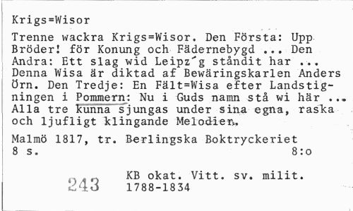 //// Krigs=Wisor //// Trenne wackra Krigs=Wisor. Den Första: Upp Broderi för Konung och Fädernebygd ... Den Andra: Ett slag wid Leipzig ståndit har ... Denna Wisa är diktad af Bewäringskarlen Anders örn. Den Tredje: En Fält=Wisa efter Landstigningen i Pommern: Nu i Guds namn stå wi här ... Alla tre kunna sjungas under sina egna, raska och ljufligt klingande Melodier». //// Malmö 1817, tr. Berlingska Boktryckeriet 8 s. 8:0 //// 230 KB okat. Vitt. sv. milit. //// 1788-1834 ////