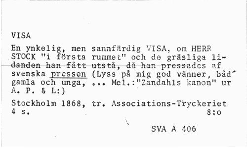 //// VISA //// En ynkelig, men sannfärdig VISA, om HERR STOCK "i första rummet" och de gräsliga li-danden han fått utstå, då han pressades af svenska pressen (Lyss på mig god vänner„ båd" gamla och unga, ... Mel.:"Zandahls kanon" ur A. P. & L:) //// Stockholm 1868, tr. Associations-Tryckeriet 4 s. 8:0 //// SVA A 406 ////