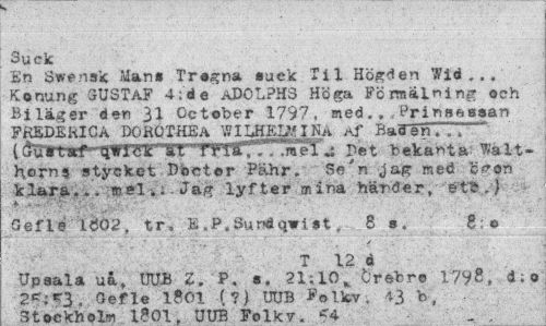 //// Suck //// En Swensk Man» Trevna »uck Til Högden Wid... Konung GUSTAF 4; de ADOLPHS Höga Förmäl ning och Biläger den 31 Gctober 1797, medPrinsessan FKEDÉhICA Dö HÖ THE A WILHELMINA Af Baden."., ** (fal fart*HWlgJE tx friåTTr^j Det bekanta Walt-horns stycket Docter Pähr. Se"n jag med öron klara...» el.: Jag lyfter m ina händer, é't£.) //// Geflé 1<?02, tr, K . P, Su nd qv i 91, 8 s. g;* //// T 12 i //// Upsala ua, UUE Z. P. a. 21.;1<\ treb.ro 1?V8, d;o 2C; . Gefle 1Ä01 ( ?) UUB ^olltv. 43 b, 3tof»khoiw iPcn nrm T?nTirtr ca ////