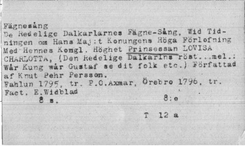 //// I ¦ //// Fägnesang //// hedelige Dalkarlarnes Fägne-Sitng, Wid Tidningen ora Han® Maj;t Konungens Höga Förlofning Med'Hennes Komgl. Höghet Prinsessan 10VI3A CH-vHLOTTh, (Den Kedeiige Daiicarirs Töst. ...mel.: War Kung war Gustaf se dit folk etc.) Författad af Knut Pehr Persson. //// Fahlun 179*. tr. P.C.Axmar, Örebro 1796, tr. Fact, E.Widblad //// 8 s . 8 - o //// T 12 a ////