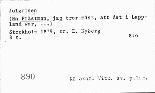 //// Julgrisen //// (En Prästman, jag tror mäst, att det i Lappland war, . >.} //// Stockholm 1*19, tr, E. Nyberg 8 r. B:o //// 890 KB Okat» Vitt. sv. p^lc.n. ////