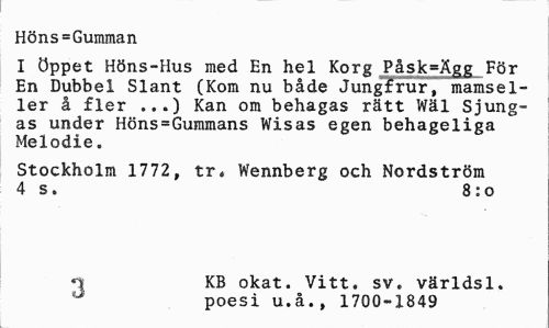 //// Höns=Gumman //// I öppet Höns-Hus med En hel Korg Påsk=Ägg För En Dubbel Slant (Kom nu både Jungfrur, mamseller å fler ...) Kan om behagas rätt Wäl Sjungas under Höns=Gummans Wisas egen behageliga Melodie. //// Stockholm 1772, tr„ Wennberg och Nordström 4 s. 8:0 //// «-* KB okat. Vitt. sv. världsl. //// 0 poesi u.å., 1700-1849 ////