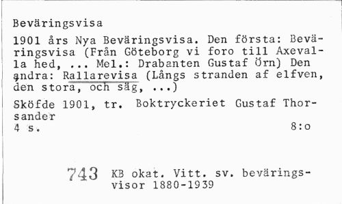 //// Beväringsvisa //// 1901 års Nya Beväringsvisa. Den första: Beväringsvisa (Från Göteborg vi foro till Axeval-la hed, ... Mel.: Drabanten Gustaf örn) Den ^ndra: Rallarevisa (Långs stranden af elfven, den stora, och säg, //// Sköfde 1901, tr. Boktryckeriet Gustaf Thor-s änder //// 4 s. 8:o //// 743 KB okat. Vitt. sv. bevärings- //// visor 1880-1939 ////