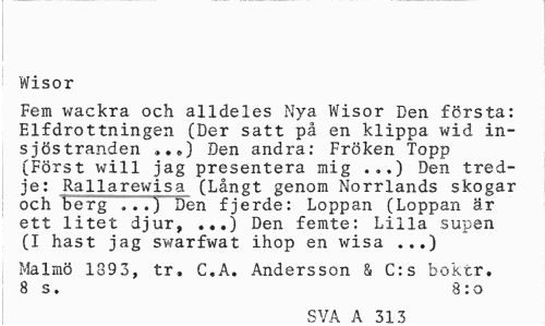 //// Wisor //// Fem wackra och alldeles Nya Wisor Den första: Elfdrottningen (Der satt på en klippa wid insjöstranden „.<>) Den andra: Fröken Topp (Först will jag presentera mig ...) Den tredje: Rallarewisa (Långt genom Norrlands skogar och berg V. .)" Den fjerde: Loppan (Loppan är ett litet djur, ...) Den femte: Lilla supen (I hast jag swarfwat ihop en wisa ...) //// Malmö 1893, tr. C.A. Andersson & C:s boktr. 8 s. 8:0 //// SVA A 31 3 ////