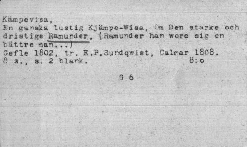 //// Kämpe v i sa, //// Sn ganska lustig Xj&ape-Wiaa, Ora Den starke och dristige Ram under, (Ramunder har wore sig en bättre man. ..)...-"* //// Gefle 1602, tr. É.P.Sundqwist, Oalmar I808. 8 s., s. 2 blank.. 8;o //// 0 6 ////