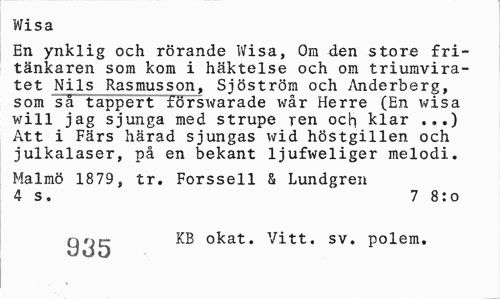 //// Wisa //// En ynklig och rörande Wisa, Om den store fritänkaren som kom i häktelse och om triumviratet Nils Rasmusson, Sjöström och Anderberg, som så tappert förswarade wår Herre (En wisa will jag sjunga med strupe ren och klar ...) Att i Färs härad sjungas wid höstgillen och julkalaser, på en bekant ljufweliger melodi. //// Malmö 1879, tr. Forssell & Lundgren 4 s. 7 8:o //// q KB okat. Vitt. sv. polem. ////