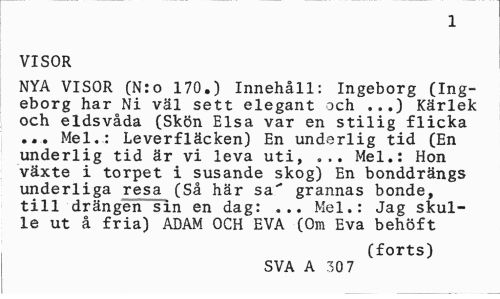 //// 1 //// VISOR //// NYA VISOR (N:o 170.) Innehåll: Ingeborg (Ingeborg har Ni väl sett elegant och ...) Kärlek och eldsvåda (Skön Elsa var en stilig flicka ... Mel.: Leverfläcken) En underlig tid (En underlig tid är vi leva uti, ... Mel.: Hon växte i torpet i susande skog) En bonddrängs underliga resa (Så här sa" grannas bonde, till drängen sin en dag: ... Mel.: Jag skulle ut å fria) ADAM OCH EVA (Om Eva behöft //// (forts) //// SVA A 30 7 ////