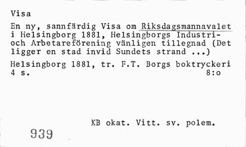 //// Visa //// En ny, sannfärdig Visa om Riksdagsmannavalet i Helsingborg 1881, Helsingborgs Industri-och Arbetareförening vänligen tillegnad (Det ligger en stad invid Sundets strand ...) //// Helsingborg 1881, tr. F.T. Borgs boktryckeri 4 s. 8:o //// KB okat. Vitt. sv. polem. //// 939 ////