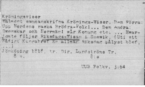 //// Kröningaviscr //// Wälme^t arvwnanakrifna Kröni n^s-Wi a or. D^n Vörra: Upp Nordena raaka Bröd ra-*'ol> l ... Den ^ndra; Swnrskar och Eorraänl wir Konung etc. ... Hi»ar~ jemte följer Riksdaan i Snewik, (Uti stt Nåd if»t" Kunp-atT!r u'1 t^aT RJkada* pålyat hlef, //// J önköoing 1.8lP, tr. Dir. Lund a t rom a Tr. 8 h. c:o //// UUB Folkv. 3:64 ////