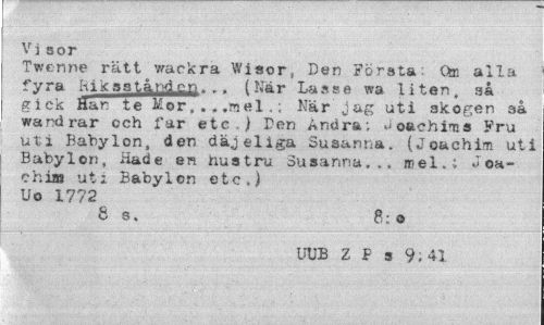 //// Vj sor //// Twenne rätt wackra Wisor, Den Första: Cte alla fyra Riksstånden..- (När Lasse wa liten, gick lar te Mor, . ,; När jag uti skogen så //// wardrar och far etc.) Ten Ändra; ^oachima Fru uti Babylon, den däjeliga Susanna. (Joachim uti Babylon, Hade en huatru Susanna,., mel. i Joachim uti Babylon etc.) Uo 1772 //// 8 s, 8;o //// UUB Z f a 9.41 ////