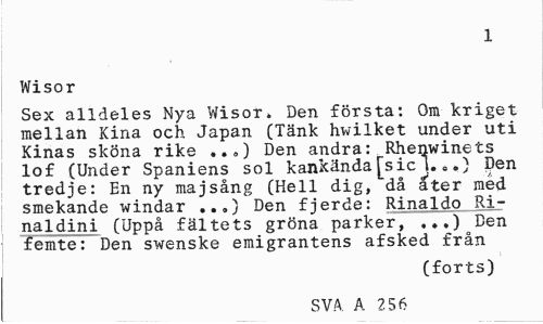//// 1 //// Wisor //// Sex alldeles Nya Wisor» Den första: Om kriget mellan Kina och Japan (Tänk hwilket under uti Kinas sköna rike ..<,) Den andra: Rhenwinets lof (Under Spaniens sol kankända[sicJ...) Den tredje: En ny majsång (Hell dig, då ater med smekande windar ...) Den fjerde: Rinaldo Ri-naldini (Uppå fältets gröna parker, femte: Den swenske emigrantens afsked från //// (forts) //// SVA. A 256 ////